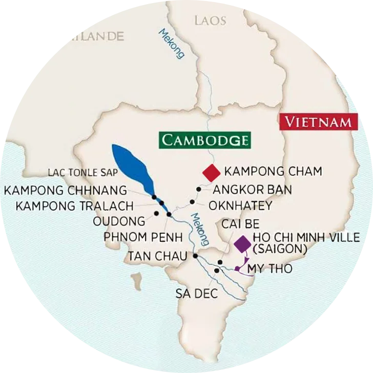 Encadré par les visites exceptionnelles du spectaculaire site d’Angkor et celle de la trépidante Ho Chi Minh ville, l’ancienne Saïgon, ce voyage paisible au fil de l’eau est une introduction évocatrice à la découverte de la péninsule indochinoise. Cette croisière sur le quatrième plus grand fleuve d’Asie fait traverser des paysages variés de la basse vallée au delta du Mékong. Considérée comme le grenier à riz des pays voisins, c’est une région vivante et très agricole. En plus de la culture du riz, des fruits ou des plantes maraîchères, les habitants pratiquent un artisanat raffiné. Certains villages produisent de la soie, du papier ou des objets en bambou tressé.
