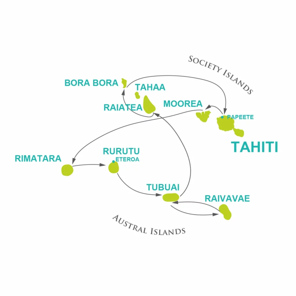 En plus des Australes, l’Aranoa vous emmènera vers Moorea, l’île aux montagnes majestueuses, Raiatea et son site archéologique classé UNESCO, avant de conclure en apothéose sur la perle du Pacifique : Bora Bora.