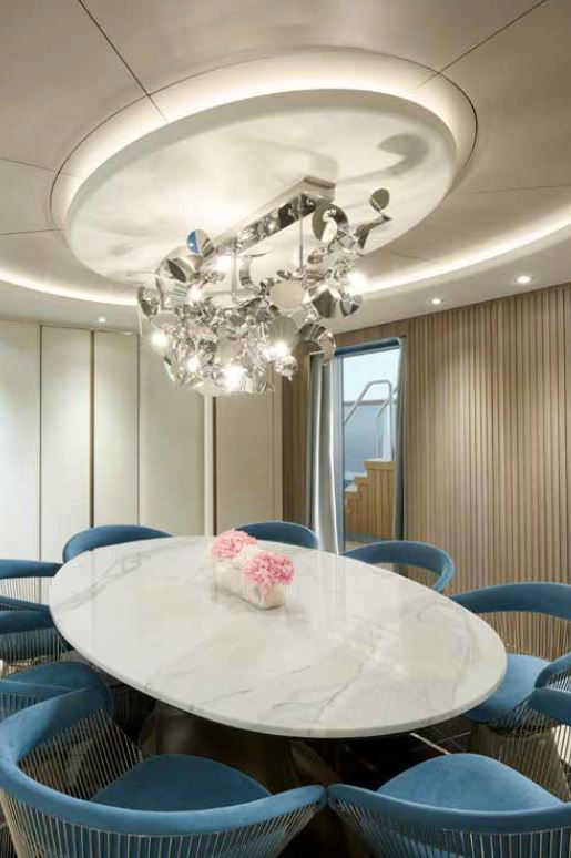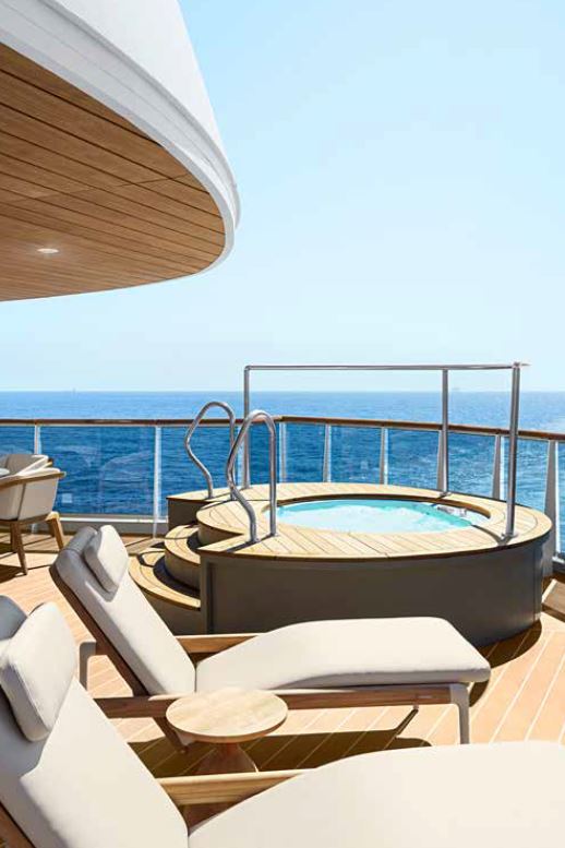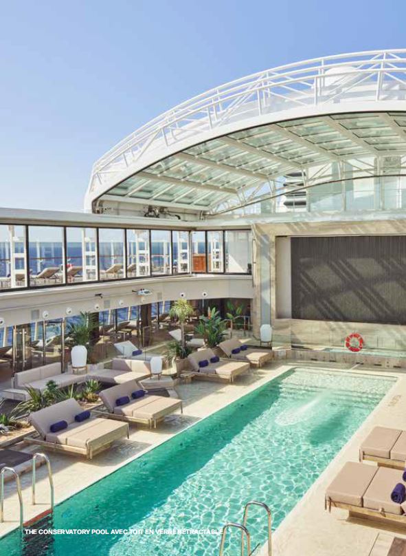 Lancé en 2024, ce navire fixe les nouveaux standards de l’ultra-luxe : suites spacieuses avec balcon, vastes espaces communs lumineux, amples circulations (escaliers, couloirs, même les ascenseurs !) multiples salles à manger et bars décoration contemporaine et aménagement élégant et de bon goût, matériaux luxueux. Dans le vaste foyer on se croirait à terre, dans le hall d’un grand hôtel de luxe.